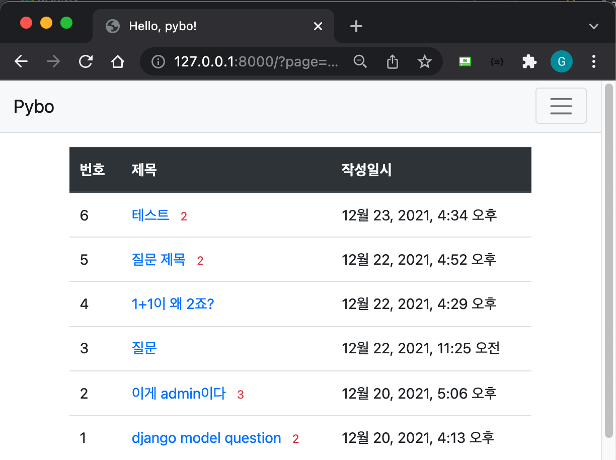 번호와 페이징은 추후에 다룰 예정이니 모른 척 넘어가고, Pybo와 로그인이 상단 좌측에 표시된것을 볼 수 있다.
