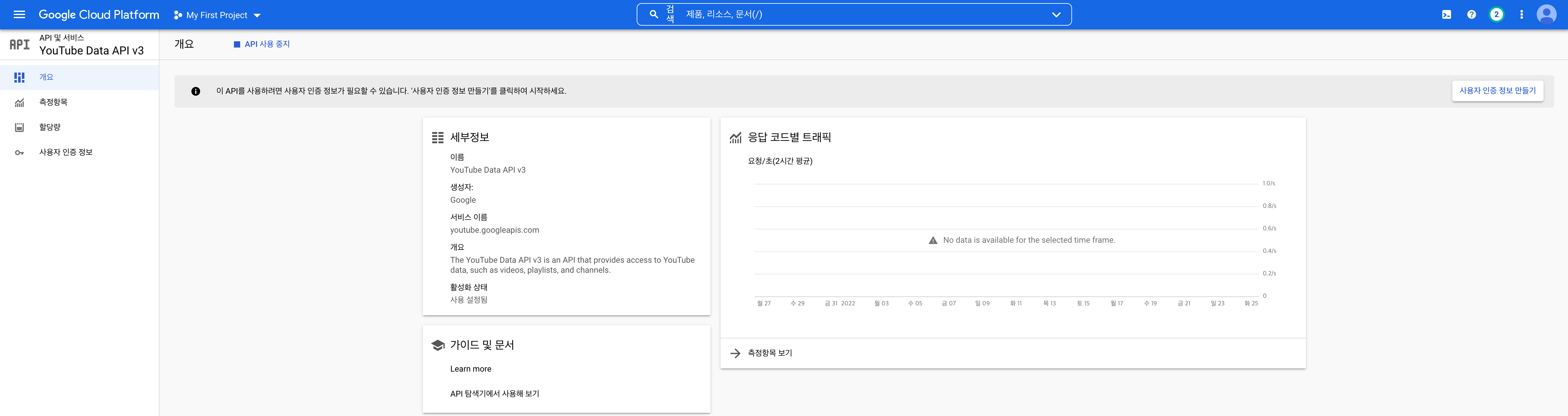검색해서 나온 결과중에 맨 위에있는 Youtube Data API v3를 누르면 위와같은 화면이 나오고, 사용을 눌러서 API를 등록하자.