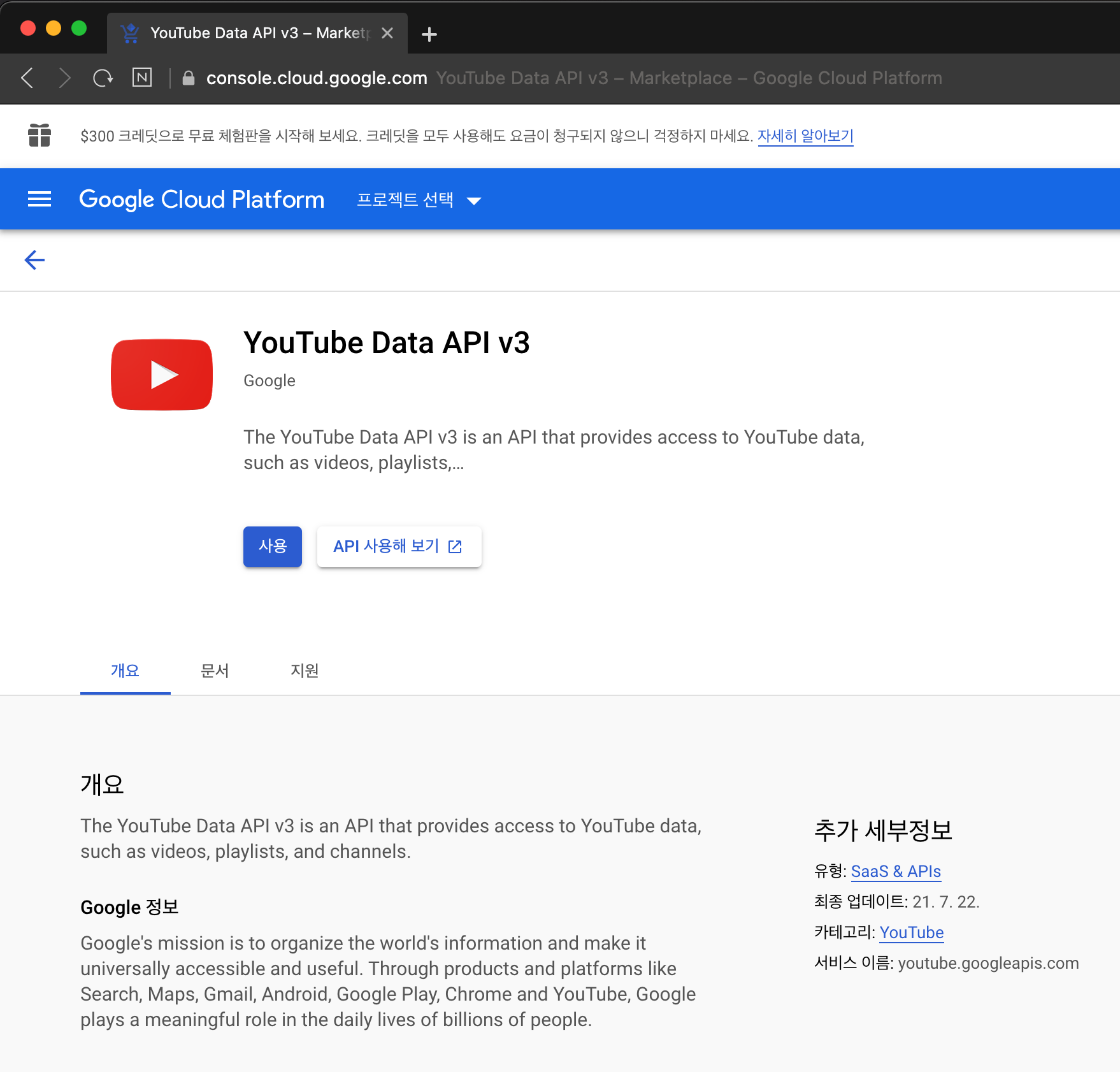 최상단에 제품/리소스검색창에 youtube data API를 검색해보자.