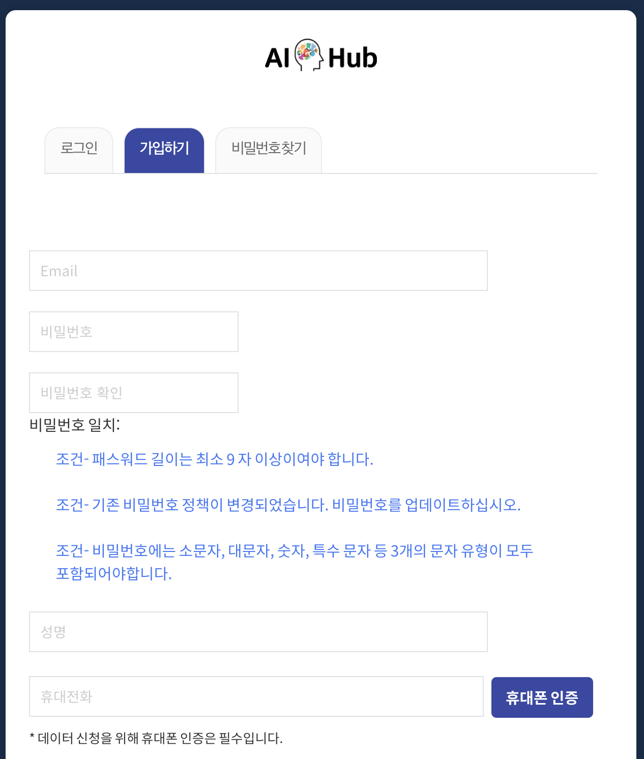 대신, 우리는 ai hub라는 국내 서비스를 활용해서 학습을 진행하고자한다.
