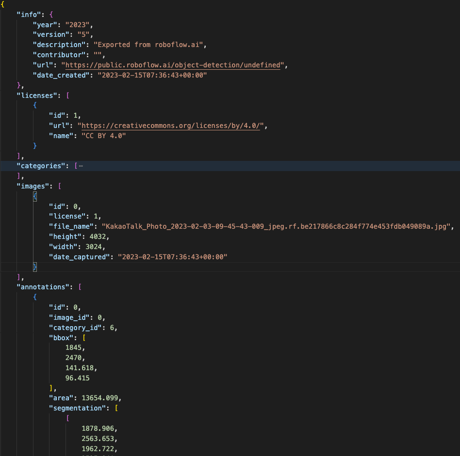 roboflow에서 데이터를 받으면 아래와 같은 json파일이 train,val,test별로 생성됩니다.