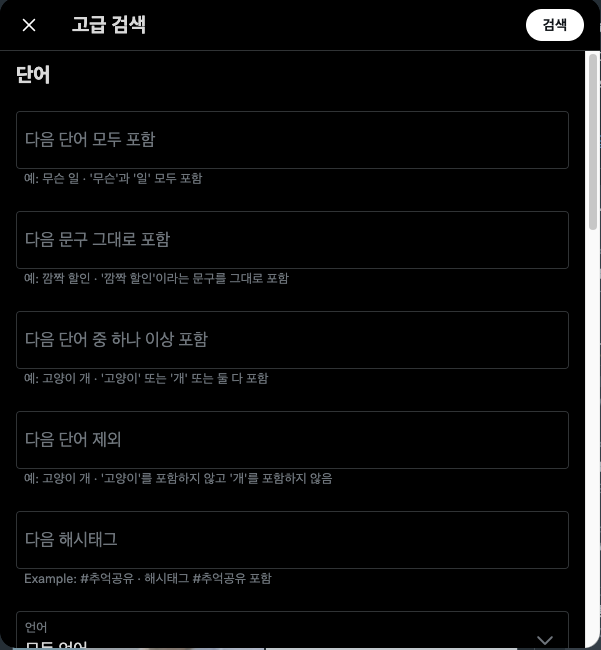 모두 포함 "그대로 포함" (하나 OR 이상 OR 포함) -제외 (#해시태그) (from:작성계정) (to:보내는계정) (@멘션한계정) min_replies:200 min_faves:200 min_retweets:200 lang:ko