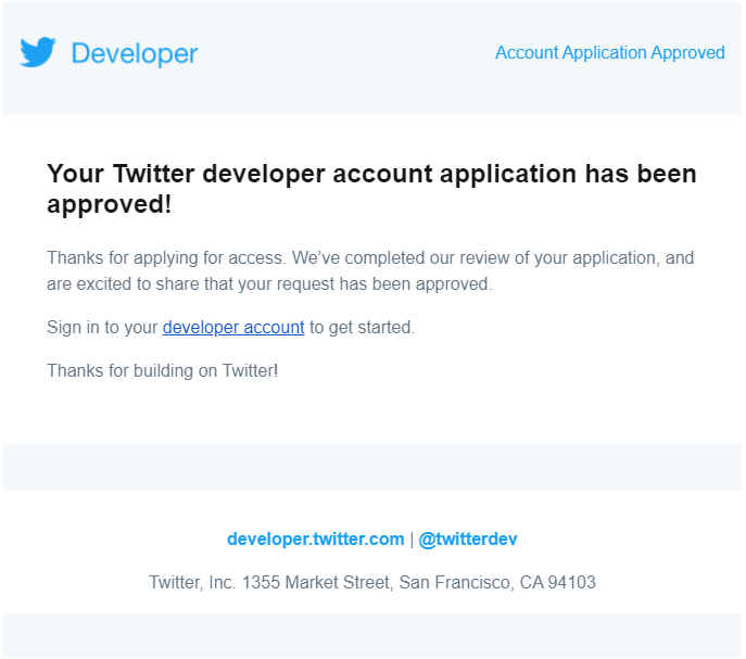이 메일이 왔다면 당신은 트위터API를 사용할 준비가 되었다는 뜻이다.