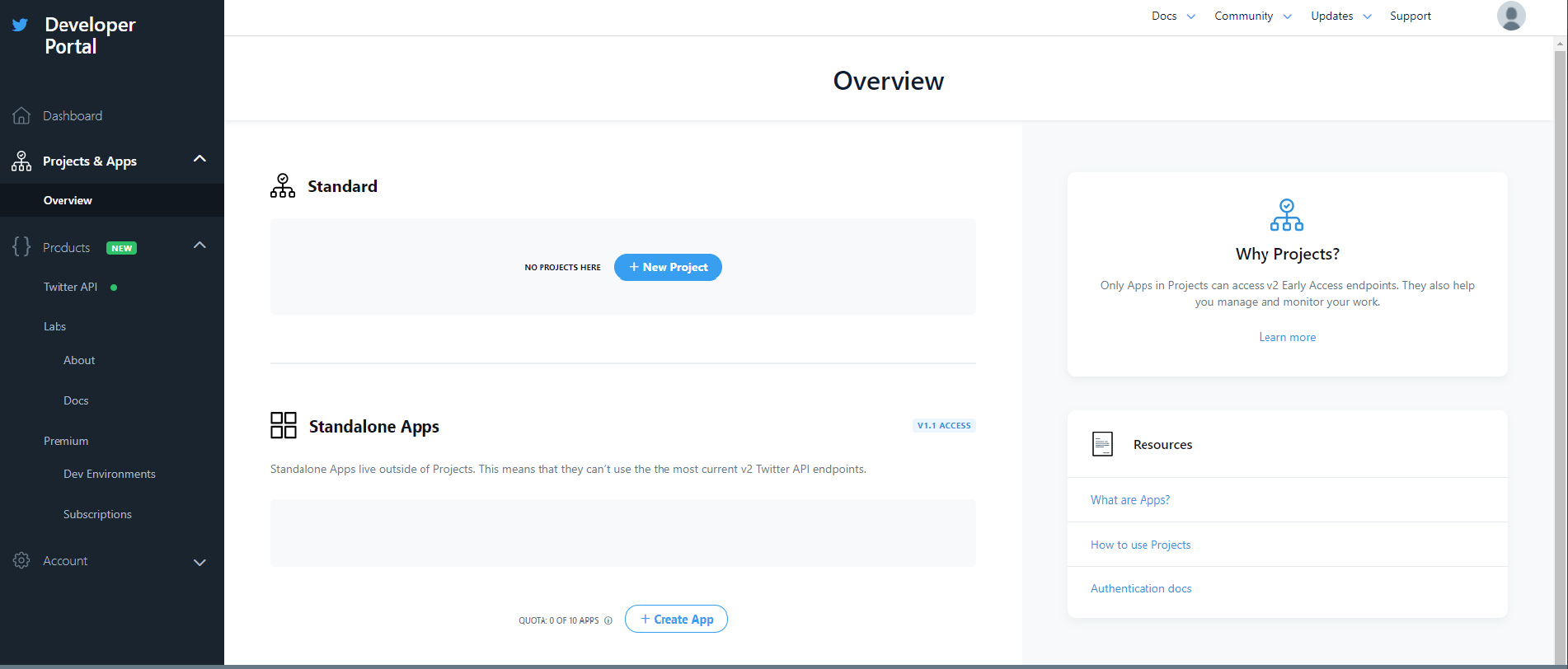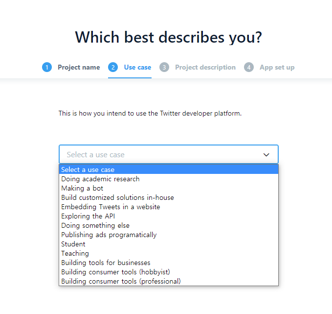 트위터 개발자포털에 들어가면 위와 같은 화면이 나온다.